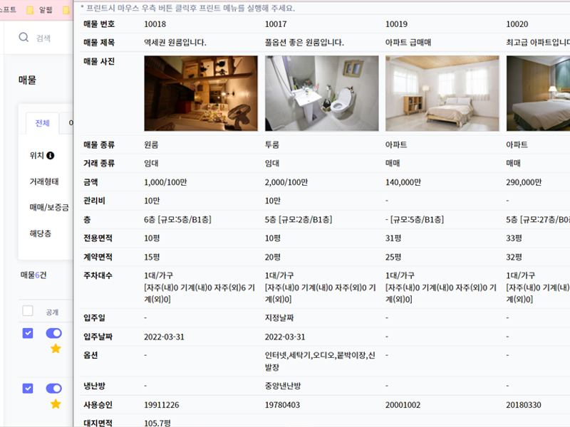 검색어를 입력하시면 시도,구군,읍면동,매물번호,매물제목,매물 설명에 해당 키워드가 들어 있으면 모두 표시해 주므로 매우 편리합니다. 관리자 화면 어디에서라도 입력하면 해당 매물들을 보여줍니다.