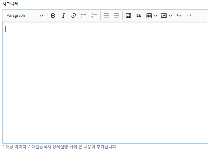 그럼 홈페이지 상에서 이 직원이 올린 매물의 설명 하단 부분에 시그니처 내용이 함께 출력 됩니다.